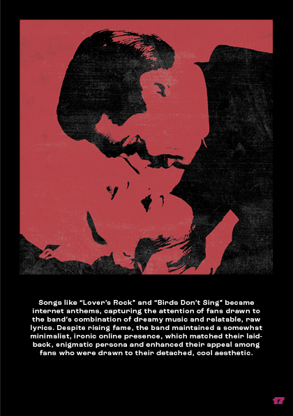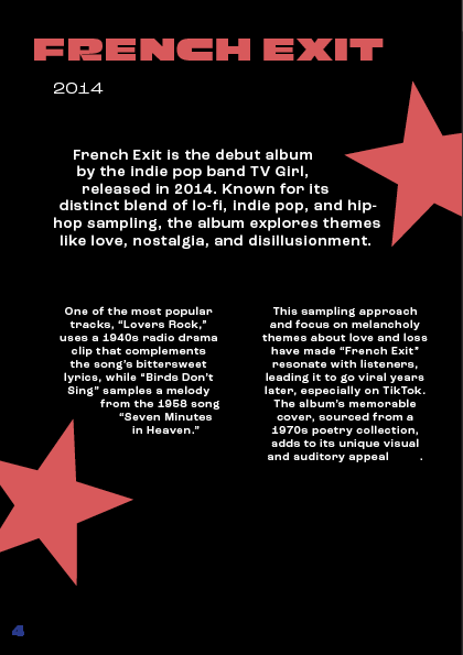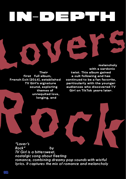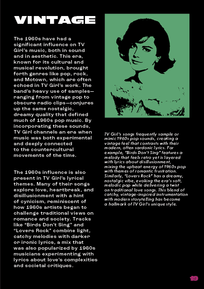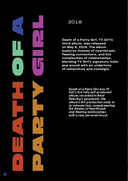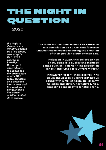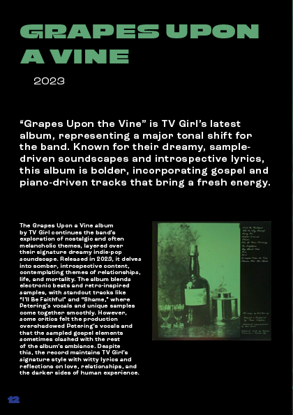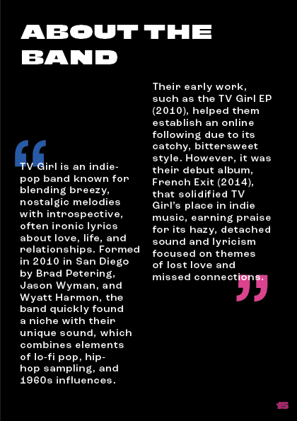 For this assignment, we were tasked with creating a magazine centered around our favorite artist. I chose to feature TV Girl, a band whose dreamy, nostalgic sound and distinctive visual style really resonate with me. The pages shown here are selected spreads from the magazine I designed, capturing the mood, aesthetic, and story behind their music.